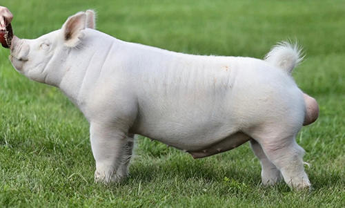 Intriguing Champion York boar from the Illinois State fair that made alot of sense to bring to Newark! Killer option in the York game to moderate back length and add incredible depth and spring of cage! Still gives you a great look from the side with height of shoulder and attraction out front. Huge chested with a gear that doesn't stop! This guy comes from a good family that puts alot of faith in this breed and it has resulted in consistent, winning white ones!